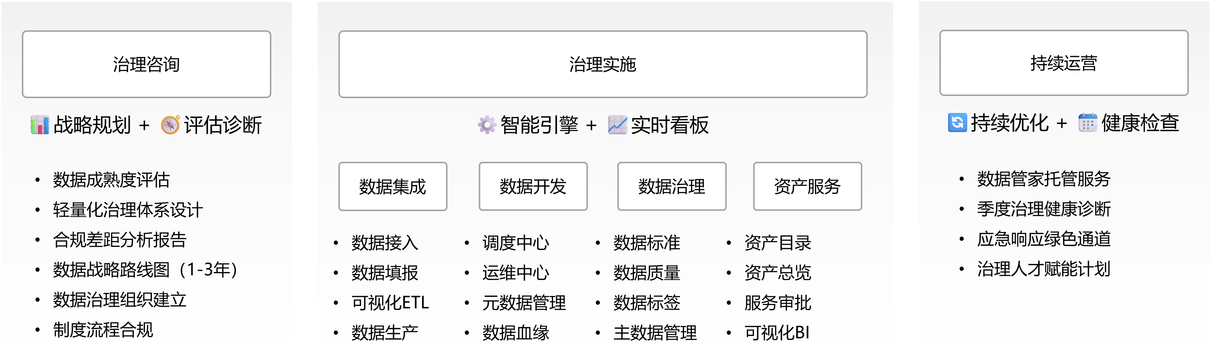 數(shù)據(jù)治理服務(wù)流程圖“樞理”從戰(zhàn)略高度出發(fā),開展數(shù)據(jù)治理咨詢。通過數(shù)據(jù)成熟度評估,精準(zhǔn)診斷企業(yè)數(shù)據(jù)管理現(xiàn)狀;設(shè)計(jì)輕量化治理體系,適配企業(yè)規(guī)模與業(yè)務(wù)特性;出具合規(guī)差距分析報告,保障數(shù)據(jù)管理符合行業(yè)規(guī)范。同時,繪制1 - 3年數(shù)據(jù)戰(zhàn)略路線圖,明確長期治理方向;協(xié)助建立數(shù)據(jù)治理組織,厘清職責(zé)分工;規(guī)范制度流程,讓數(shù)據(jù)治理“有章可循”,為后續(xù)治理筑牢頂層設(shè)計(jì)基礎(chǔ) 。