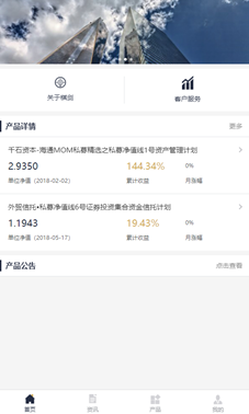 • 旗下產(chǎn)品:包括產(chǎn)品列表、凈值查看、產(chǎn)品公告三個(gè)功能模塊。