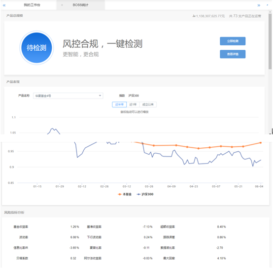 • BOSS統(tǒng)計(jì):專門針對(duì)領(lǐng)導(dǎo)層設(shè)計(jì)的產(chǎn)品總規(guī)模、產(chǎn)品表現(xiàn)、風(fēng)險(xiǎn)指標(biāo)分析檢測(cè)頁(yè)面。